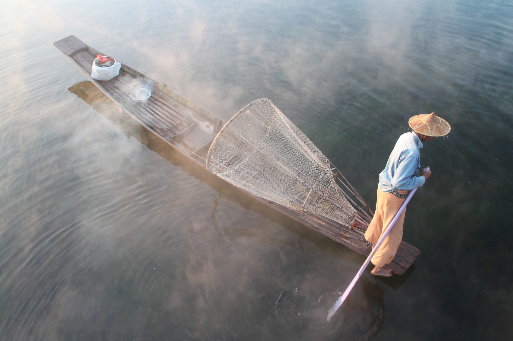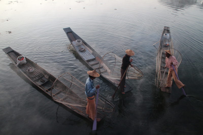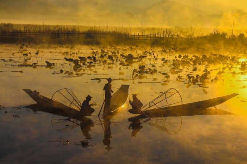 After breakfast at hotel, fly to Mandalay. After that, commence full day Inle Lake sightseeing by boat starting visit to Phaung Daw Oo Pagoda, Floating Gardens, Unique Leg-rowers, Traditional Fishing Method, Silk Weaving, Stilt House Villages on the lake and Nga Pe Chaung Monastery. Overnight at hotel in Inle. (B)